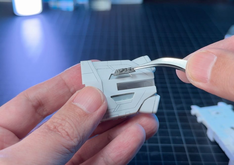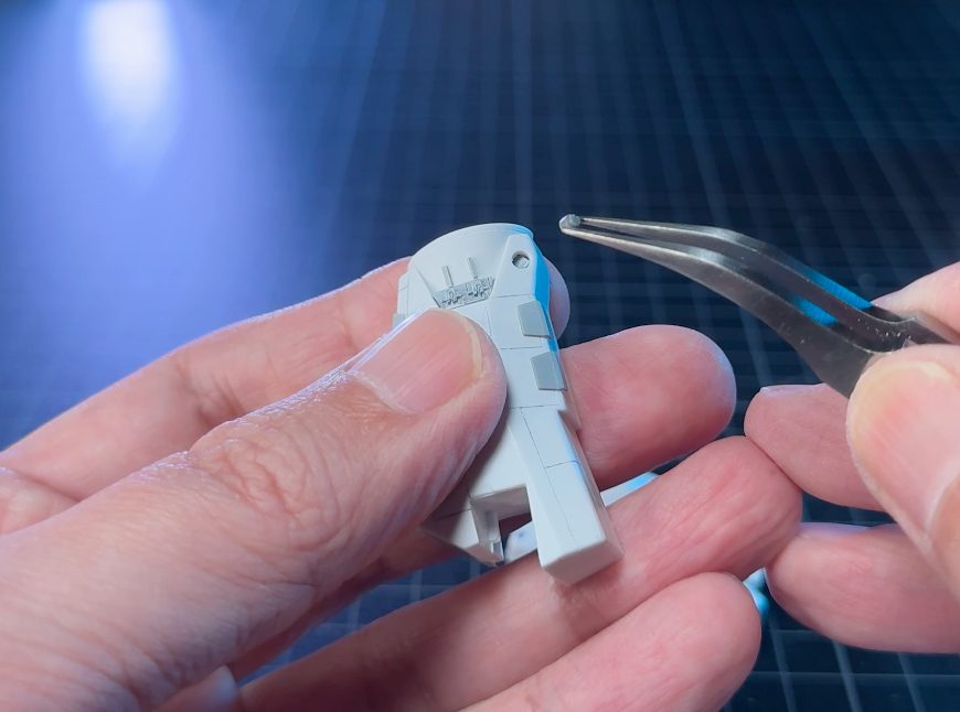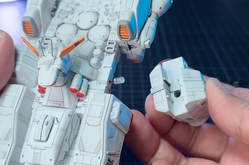 タミヤカラー エナメル塗料スカイグレイ(X-19)とホワイト(X-2)を調色した、明るめのグレーを筆塗り。一箇所のみ「バンダイスピリッツ ガンダムデカール」の連邦軍ロゴデカールを使用。