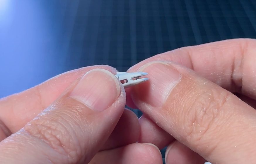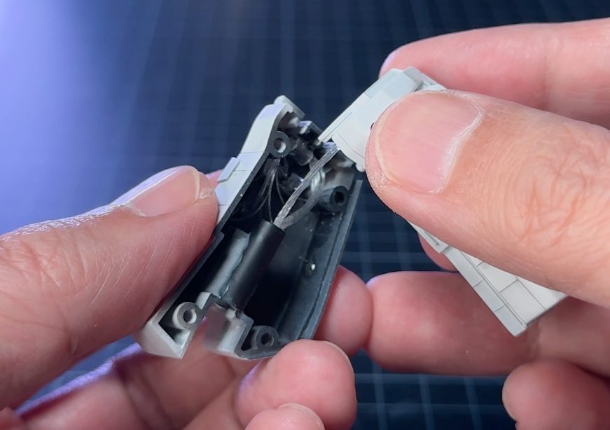 反対側のパーツからも、まとめた光ファイバーをプラパイプに突っ込みながらパーツを合わせていきます。