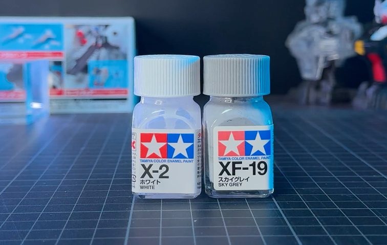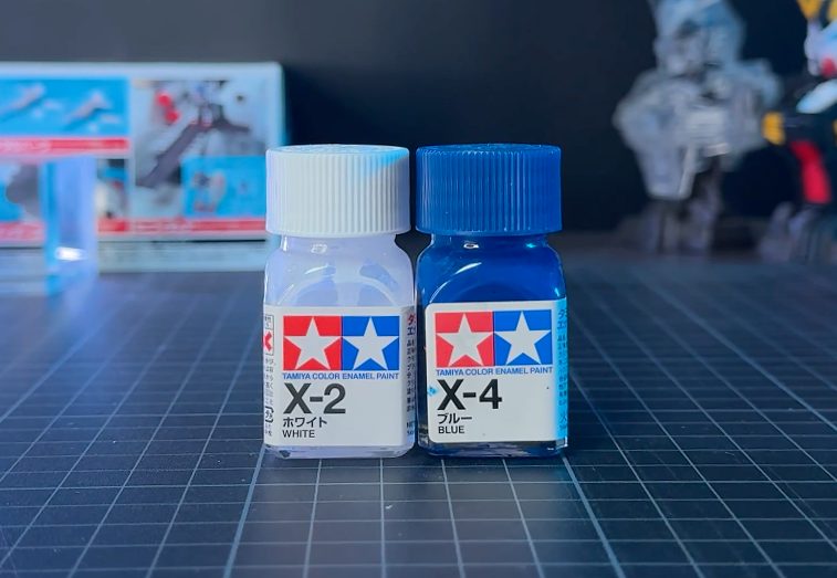 タミヤカラー エナメル塗料ブルー(X-4)とホワイト(X-2)を調色した、明るめのブルーと、