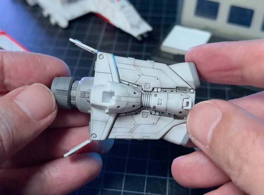スラスターは、タミヤカラー ラッカー塗料 佐世保海軍工廠グレイ(LP-13)で塗装して、