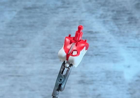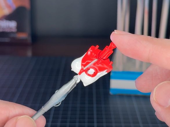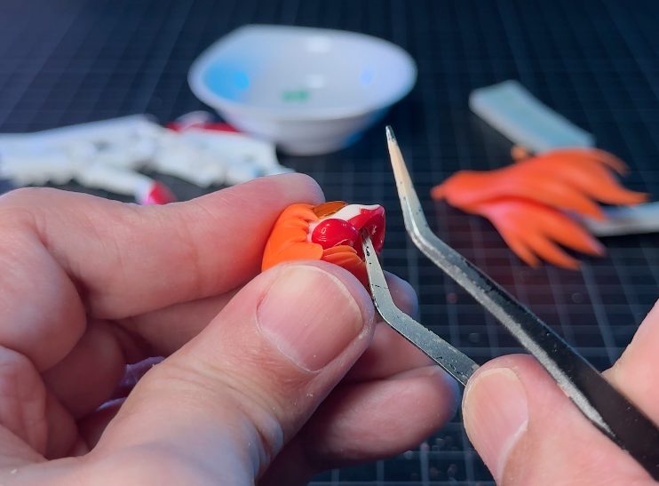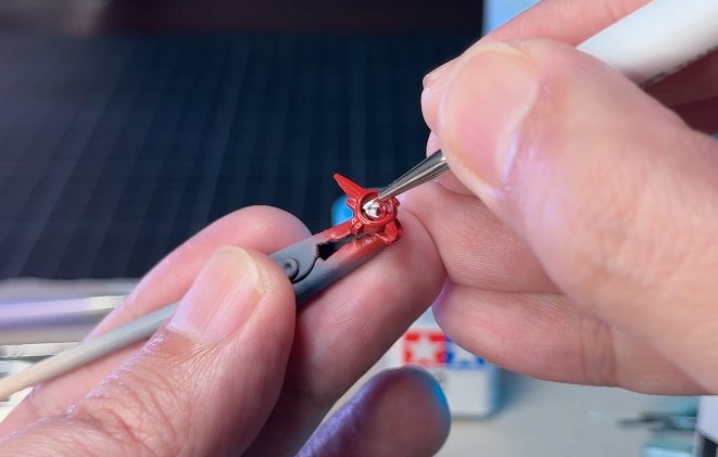 腕のフィジカルリアクター部や足のかかと部は、タミヤカラー ラッカー塗料 ピュアーレッド(LP-7)とブラック(LP-1)で濃い赤に。
