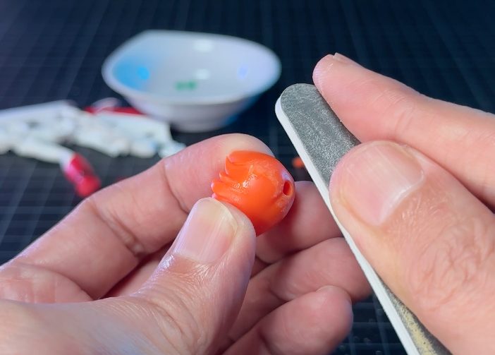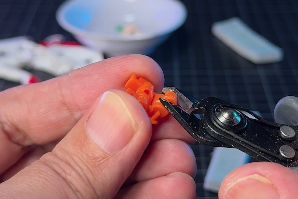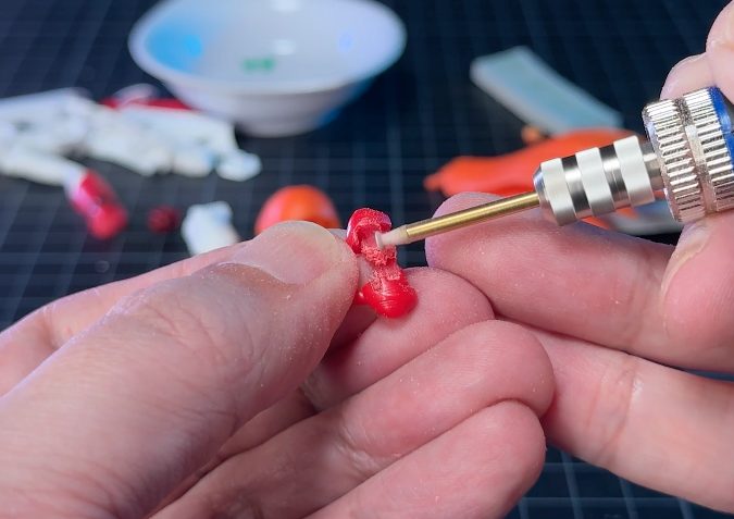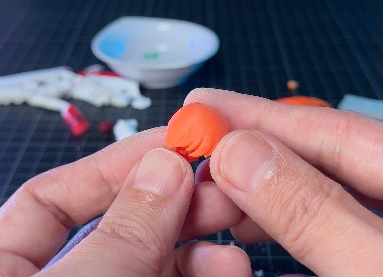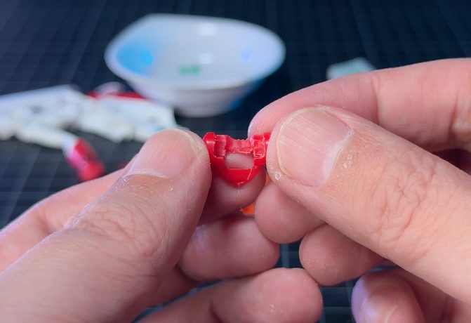 髪の毛は、数パーツに分割されているので、合わせ目を消したいところ。なので、フェイスパーツを後ハメできるように加工しました。