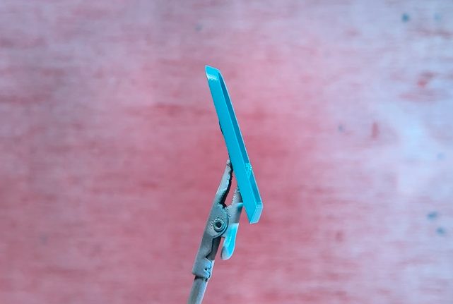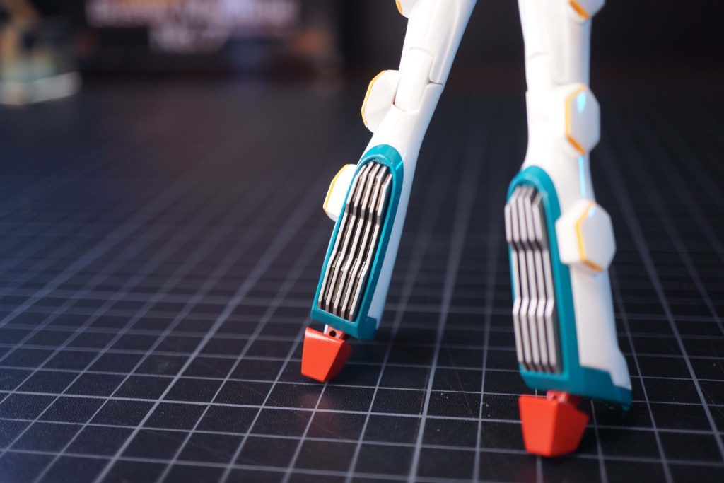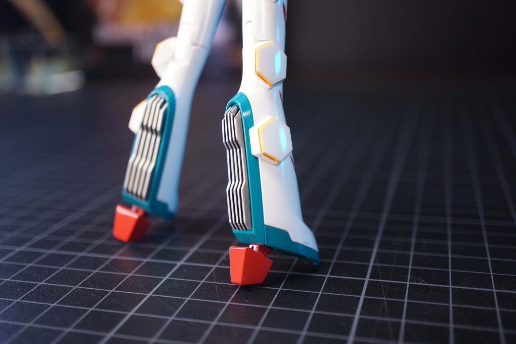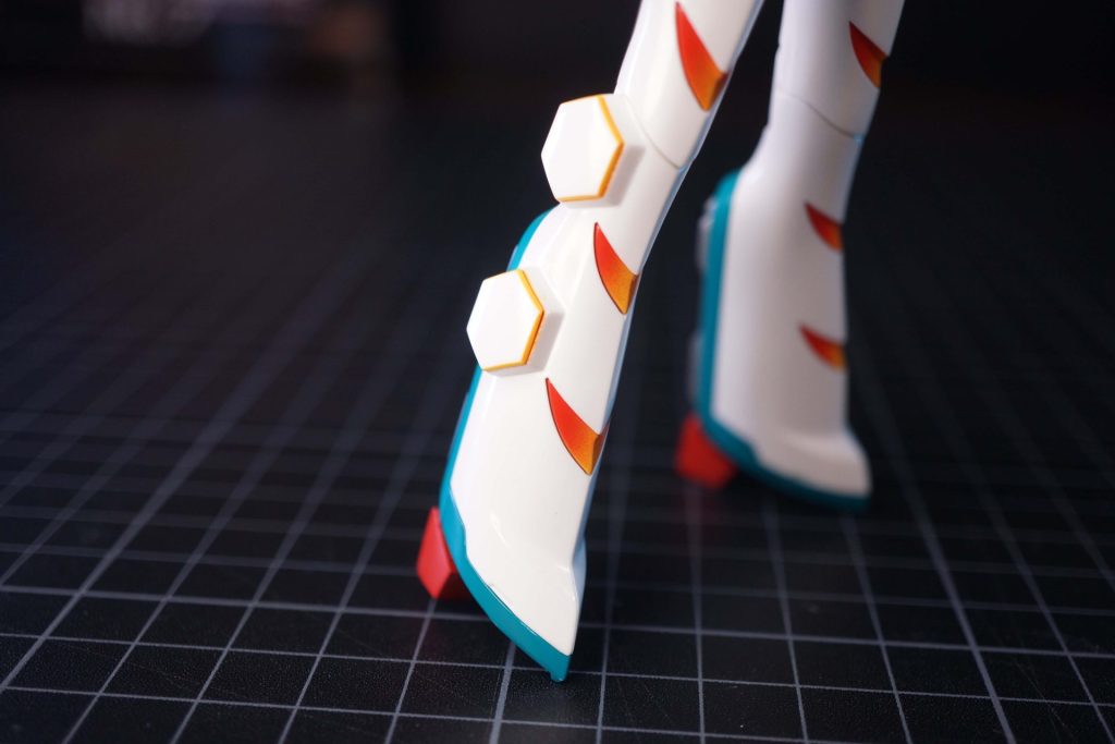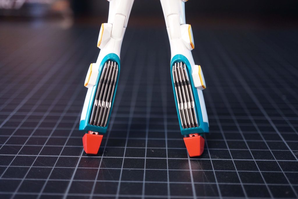 ふくらはぎ部のブルーは、少し変えてエメラルドグリーンに。使用した塗料は、タミヤカラー ラッカー塗料 ピュアーブルー(LP-6)とピュアーイエロー(LP-8)。