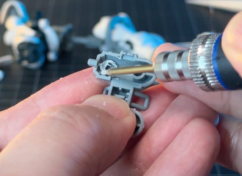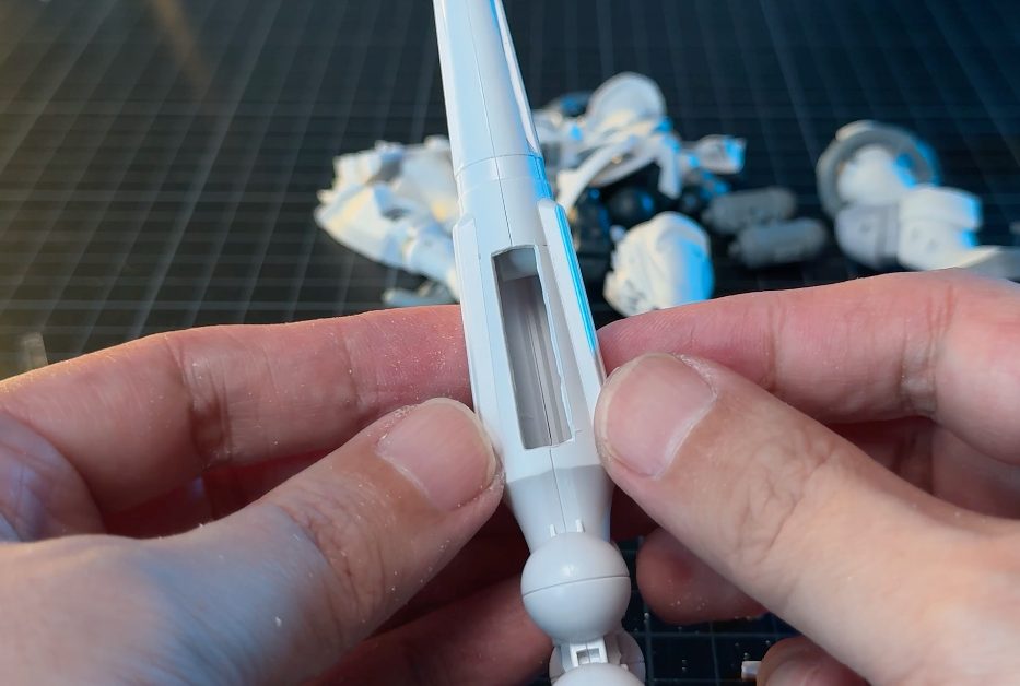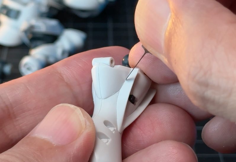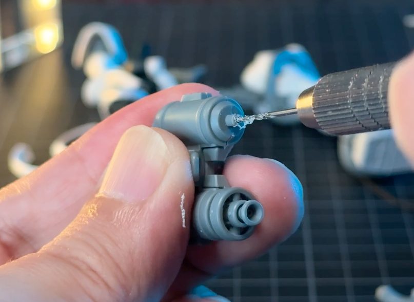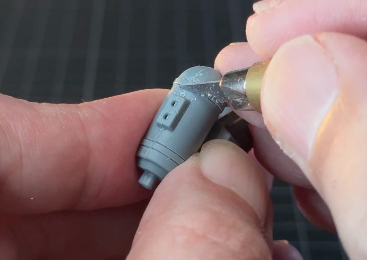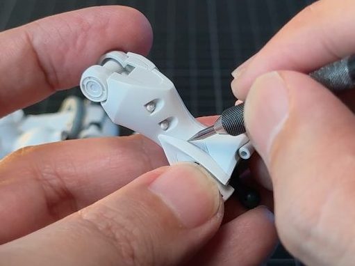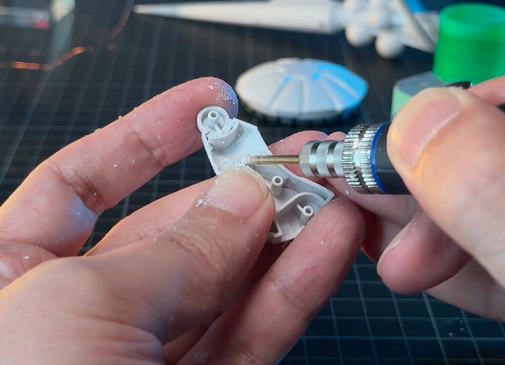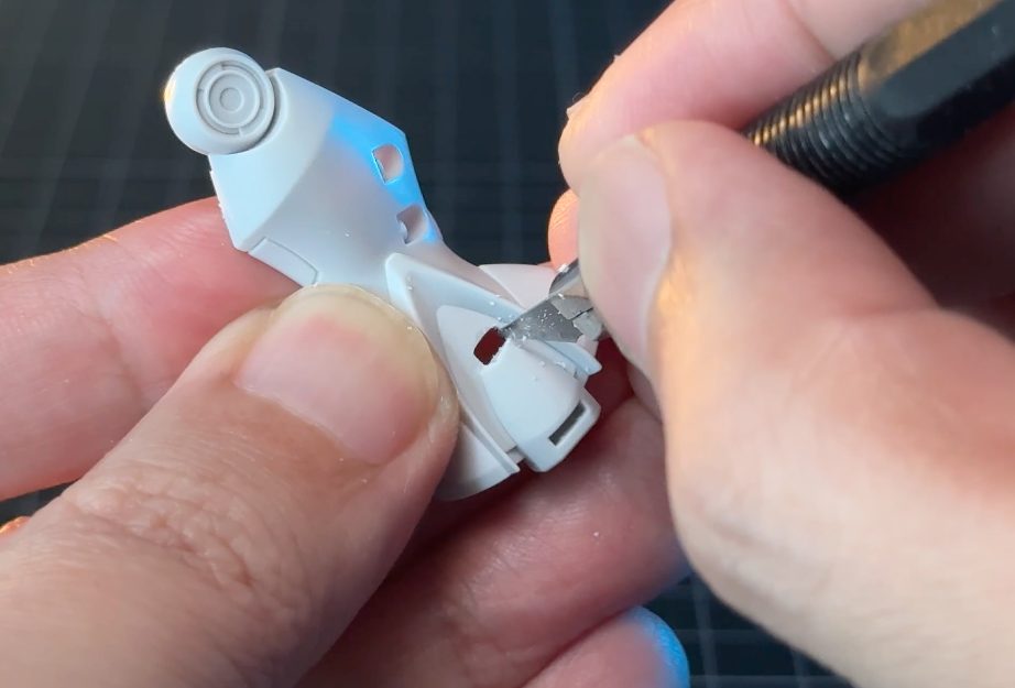 バックパックは後で接着する予定なので、塗装後にチップLEDをスムーズに通せるよう、中を削ります。