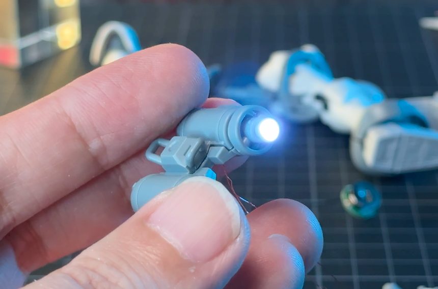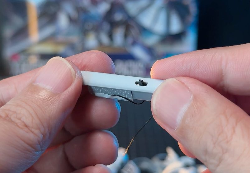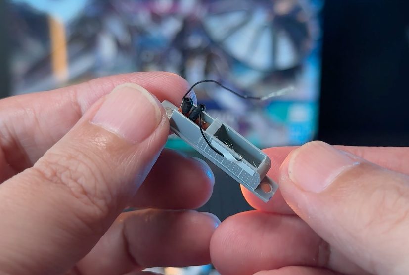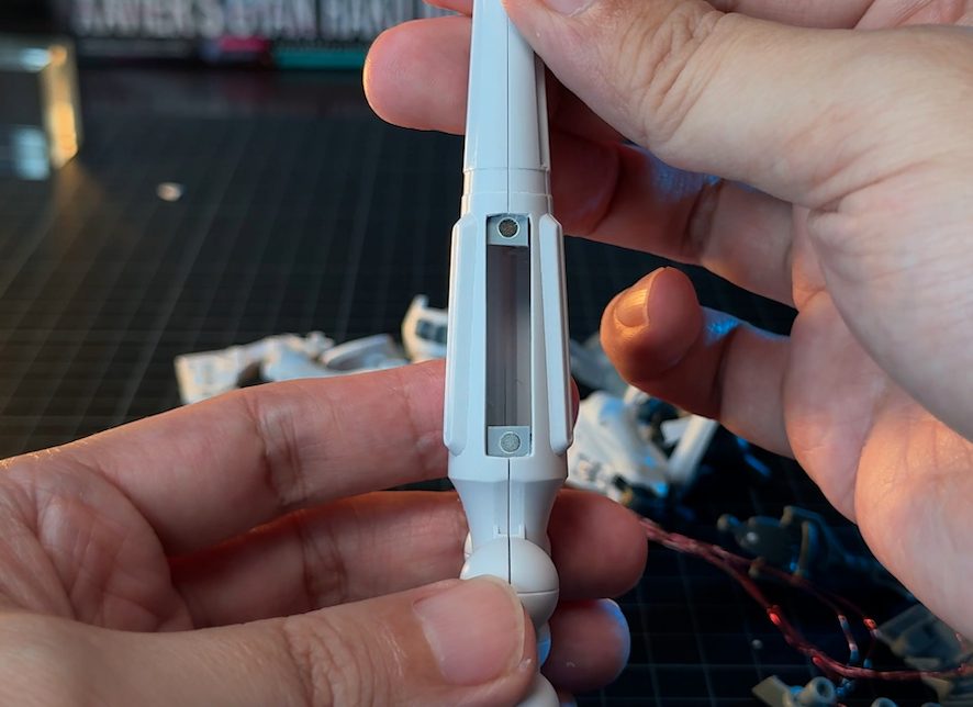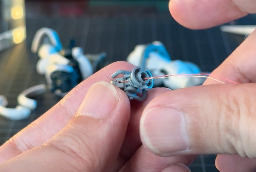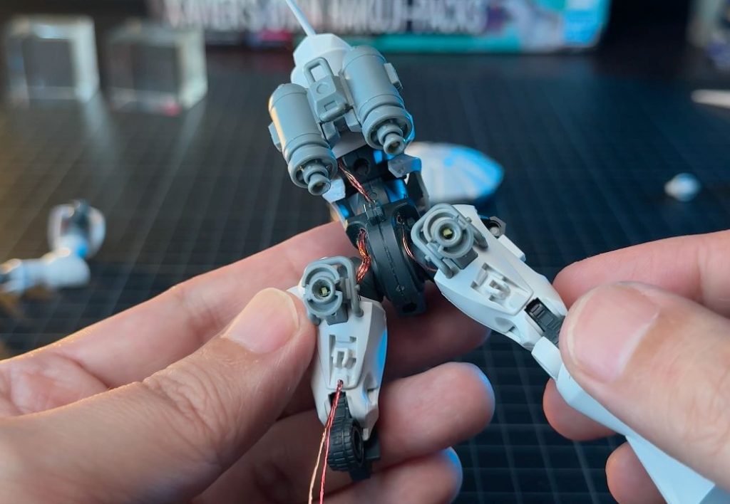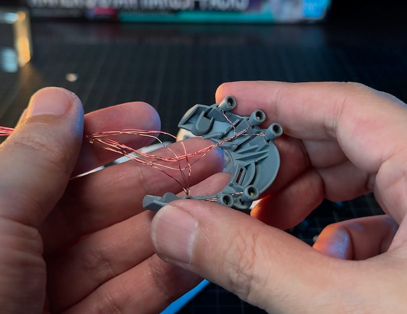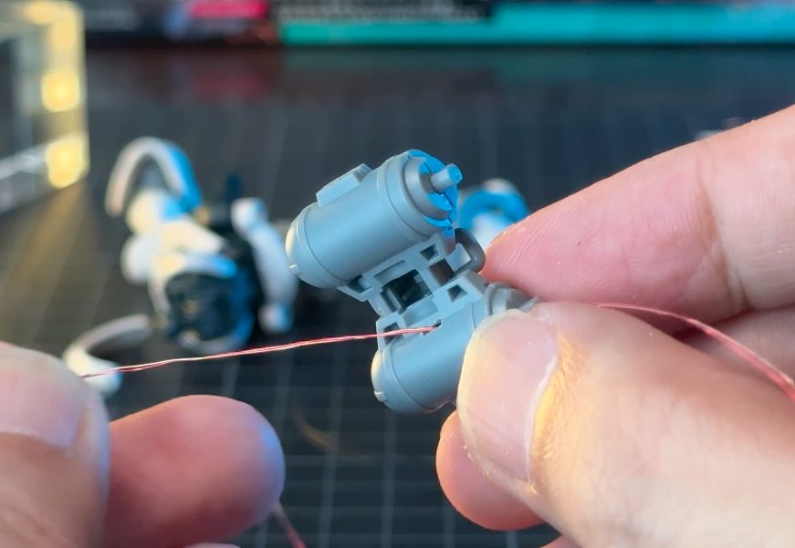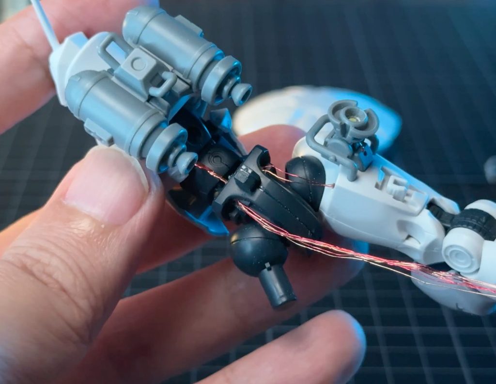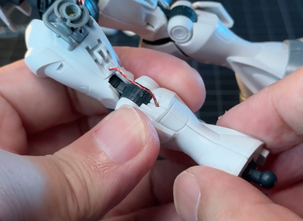 さらに、左太もも裏スラスターのチップLED導線と一緒に左ふくらはぎパーツに。