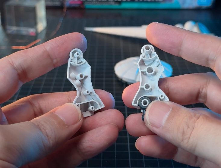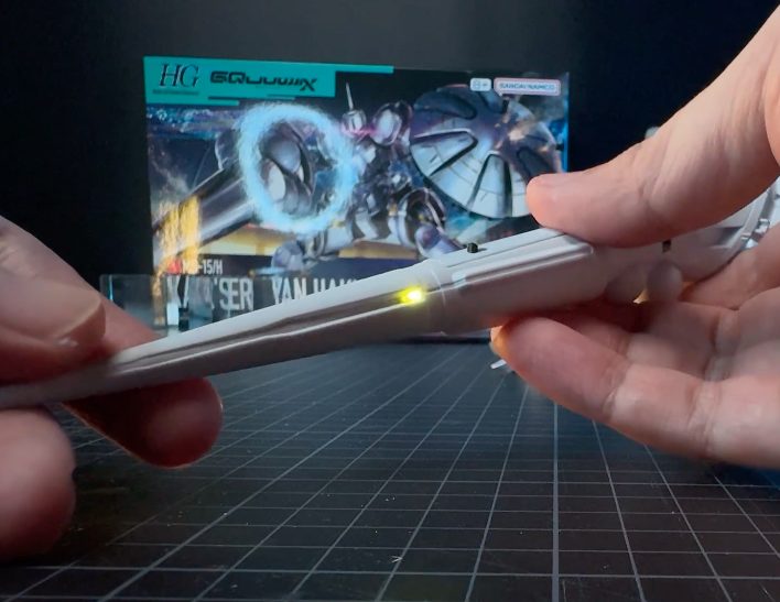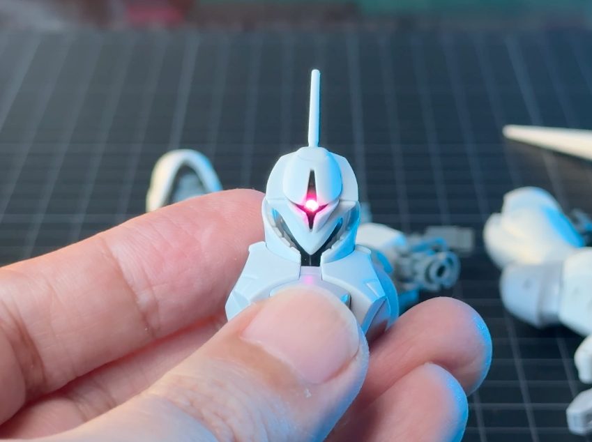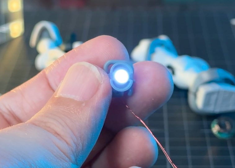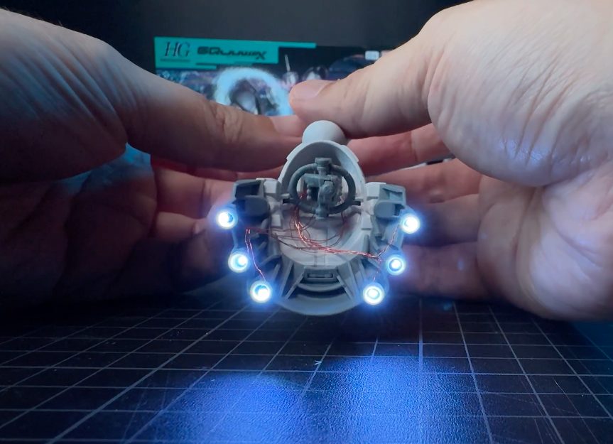モノアイ、バックパックスラスター2つ、右太もも裏スラスターのチップLED導線を全て左足に集結。