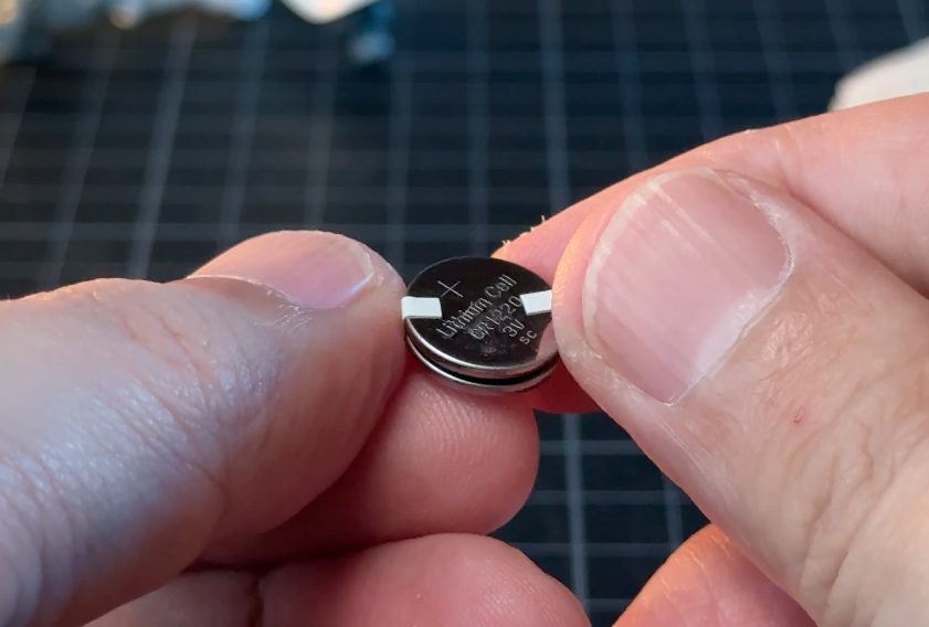 いつも使っている、ビット・トレード・ワンさんの磁気スイッチ付LEDモジュールでは、5つのチップLEDを光らすのは厳しいので、リチウム電池CR1220 3Vを2つと