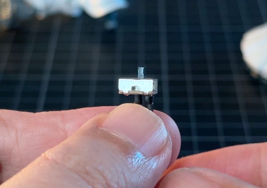 Amazonで購入したミニスイッチ「uxcell スライドスイッチ SPDT 1P2T 3ピン PCBパネルラッチ 100個入」を使用。