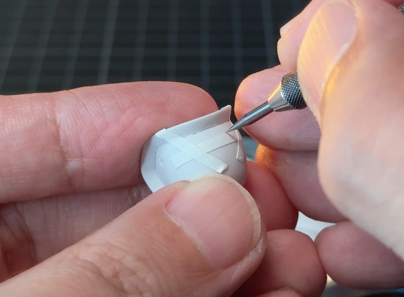 使用した道具は、タミヤのスジ彫り超硬ニードル20°&スジ彫りブレードホルダーとスジボリ堂 BMCタガネ 幅0.15mm、曲線用マスキングテープ 2mm。